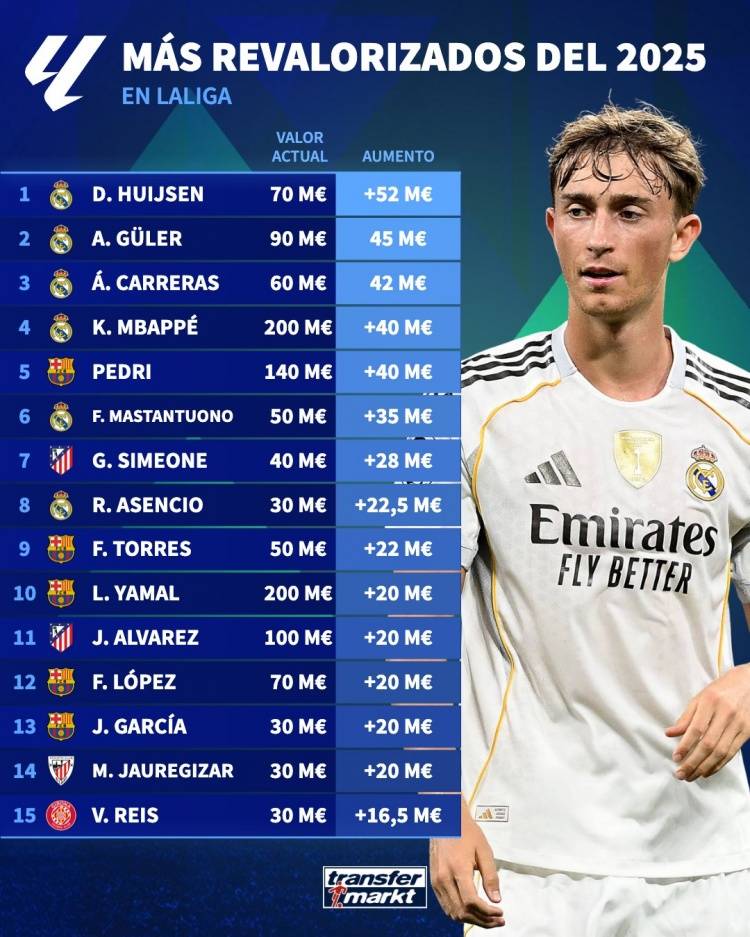 年末岁尾,德国转会市场更新的2025年西甲球员身价上涨榜引发热议。这份榜单不仅见证了球员们一个赛季的努力与蜕变,更勾勒出西甲联赛的竞争格局与人才储备态势。皇马小将赫伊森以5200万欧元的身价涨幅登顶,队友居莱尔、卡雷拉斯紧随其后,姆巴佩也跻身前列;巴萨则有亚马尔、佩德里等核心球员同步升值,马竞、赫罗纳等球队的新星亦榜上有名。皇马与巴萨包揽榜单半数以上席位,成为最大赢家,而各队年轻球员的集体爆发,更让西甲的竞争力持续提升。